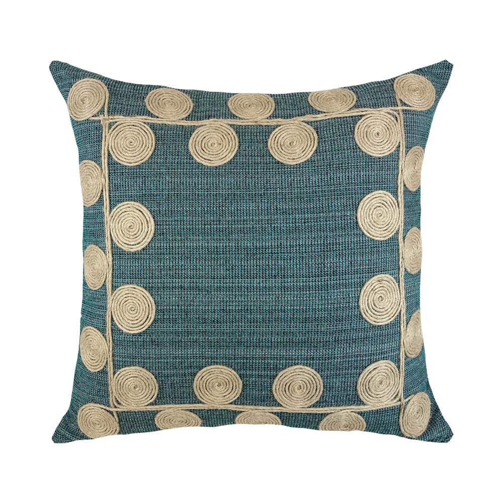 A almofada traz um estilo mais rústico, em tom Tifany com detalhes bordados em formato circular. Possui um estilo exclusivo e de feito a mão. Almofada com enchimento. Possui acabamento em vivo e zíper invisível.
