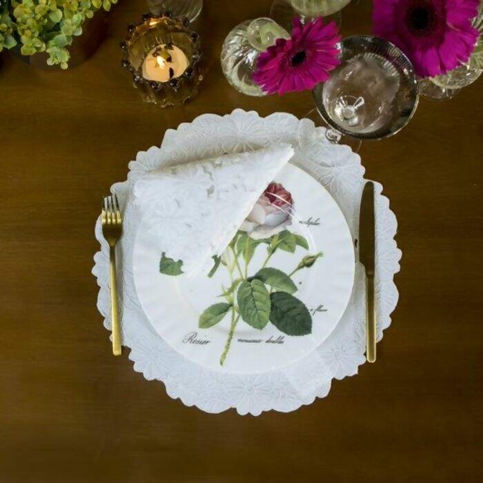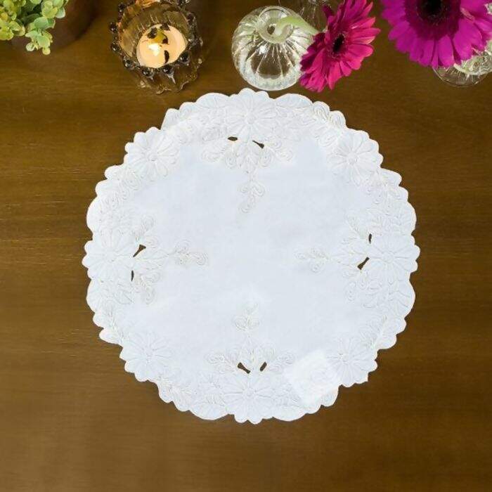 O Kit Sousplat Redondo Renda Inglesa Indonésia é confeccionado em material 100% poliéster, medindo 38cm de diâmetro, ideal para trazer personalidade para sua mesa posta. Seus detalhes delicados em bordado enobrecem a peça e transmitem muita leveza ao ambiente, além disso, é facilmente encaixado em diversas composições.