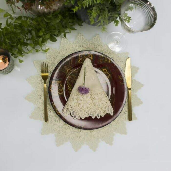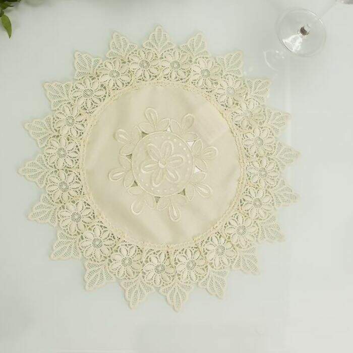 O Kit Sousplat Redondo Renda Inglesa Indonésia é confeccionado em material 100% poliéster, medindo 38cm de diâmetro, ideal para trazer personalidade para sua mesa posta. Seus detalhes delicados em bordado enobrecem a peça e transmitem muita leveza ao ambiente, além disso, é facilmente encaixado em diversas composições.