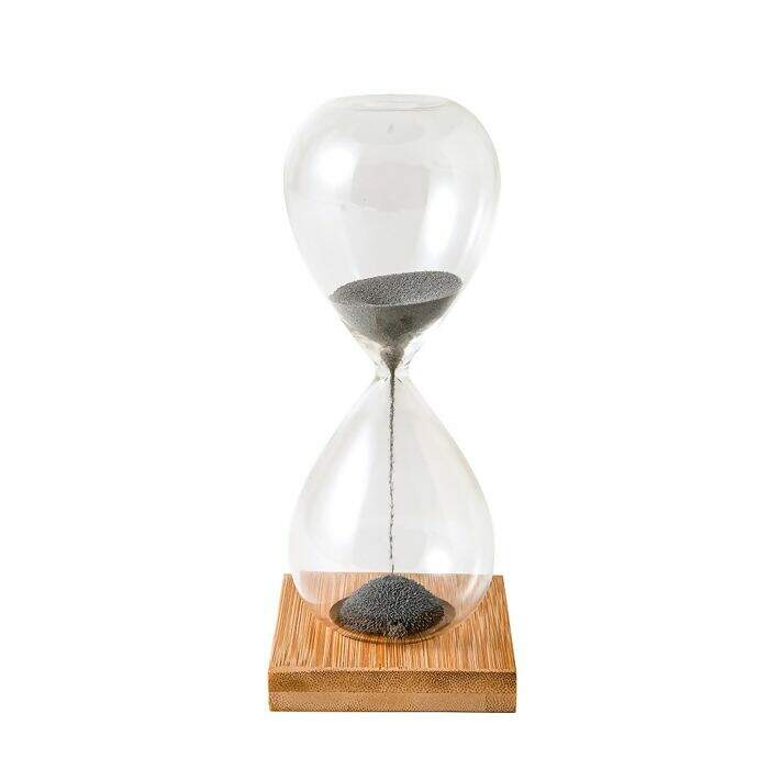 Ampulheta Decorativa em Vidro Areia Cinza com Base Magnética e base em madeira.
