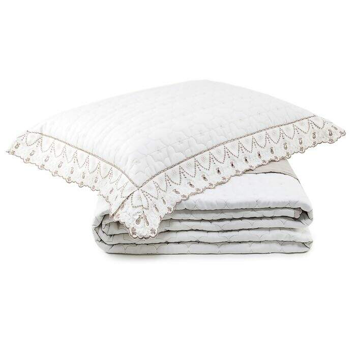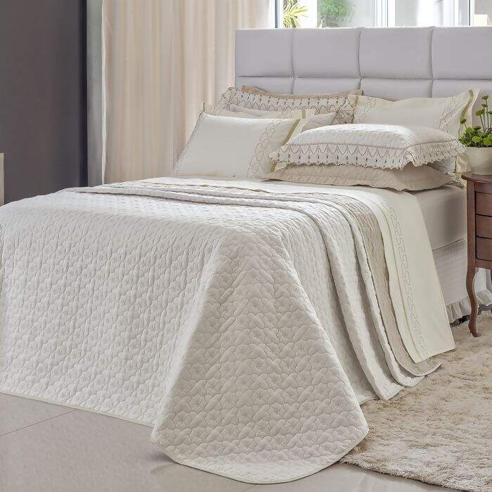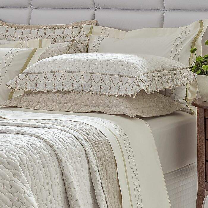 Descrição Cobre Leito / Colcha Bordada Charlote Bege / Palha Super King 3 peças - Lavive