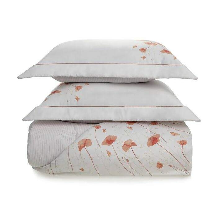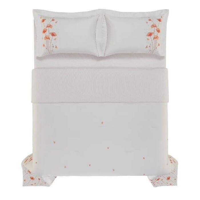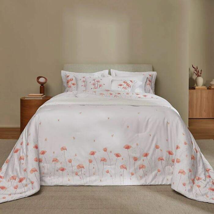 A colcha com porta travesseiro Pallaveri se destaca pela sua estampa delicada, elegante e sofisticada. Foi inspirada nas papoulas que crescem livremente pelos jardins de Bréscia. Aqui também se destaca o fatto a mano pois, foram desenhadas manualmente em aquarela e cada pincelada forma uma de suas pétalas graciosas e firmes caules. São peças que retratam o encanto, romantismo e contemporaneidade de um lindo jardim florido.