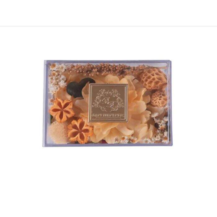 - 1 Difusor Flores, Folhas e Cascas Secas em caixa plástica transparente com detalhe em dourado;