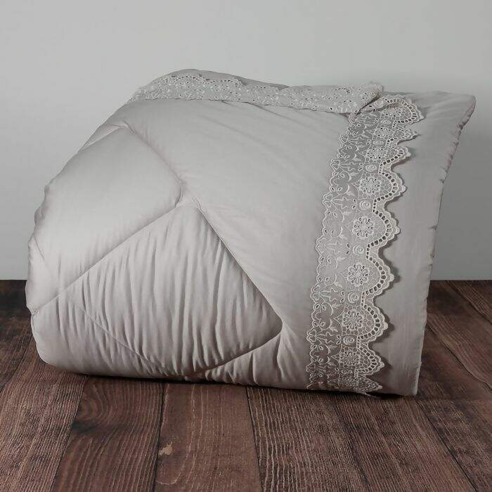 Edredom confeccionado com tecido 100% algodão egípcio 400 Fios, toque acetinado e aplicação de renda em 03 lados (bordas inferiores). Enchimento de manta acrílica sintética com 250 gr/m², que se assemelha a pluma natural proporcionando extremo conforto.