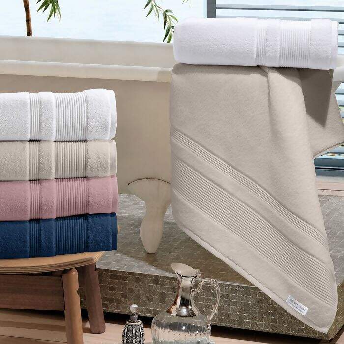As toalhas de Rosto e Banho Gigante são tecidas em fio penteado de fibras longas e dupla torção de ótima qualidade, com barra Jacquard trabalhada em alto e baixo relevo, dando um ótimo toque tendo uma alta absorção.