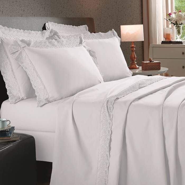 Tecido em Algodão de fio penteado com toque acetinado proporcionando leveza e sofisticação ao produto. Sobre lençol com dobra feita que recebem a delicadeza da renda, conferindo um visual requintado a cama e ao quarto.