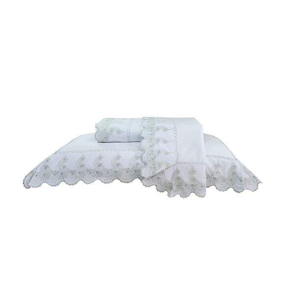 O jogo de lençol Analiza é produzido em 100% algodão 200 fios e conta com tira ricamente bordada que é a especialidade da Marken Fassi. Além do toque macio e suave, sua beleza se realça, pois, conta com duas fronhas bordadas em três abas, um maravilhoso lençol acetinado com elástico e um virol ricamente bordado.