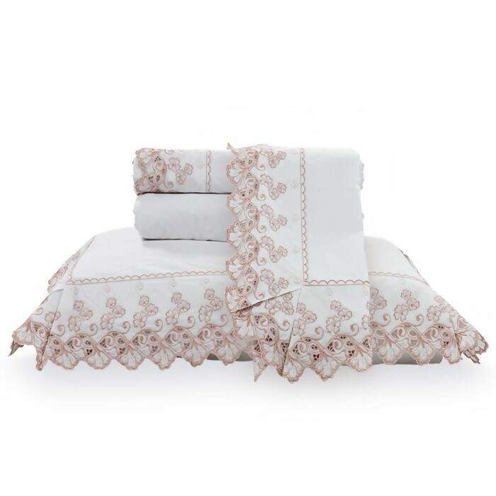 O jogo de lençol Tulip é produzido em 100% algodão 200 fios e conta com tira ricamente bordada que é a especialidade da Marken Fassi. Além do toque macio e suave, sua beleza se realça, pois, conta com duas fronhas bordadas em três abas, um maravilhoso lençol acetinado com elástico e um virol ricamente bordado.