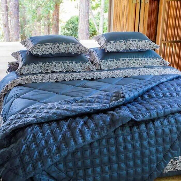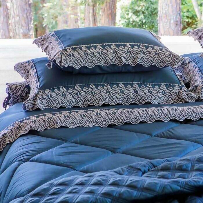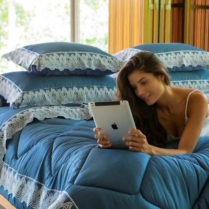 Jogo de lençol confeccionado em algodão egípcio 300 Fios com toque acetinado e aplicação de renda.
