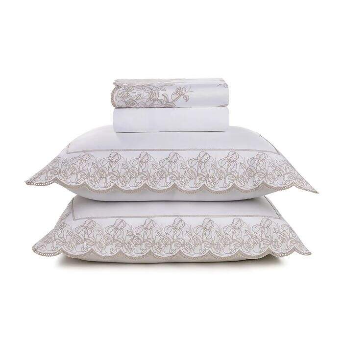 Inspirado pela elegância artística de Florença e pela delicadeza da íris, símbolo da cidade, o Jogo de Cama Queen Cascine da Trussardi é uma verdadeira obra-prima para o seu quarto. Com bordados impecáveis em cetim 300 fios, confeccionado em 100% algodão egípcio, ele traduz sofisticação e conforto supremos. O conjunto conta com lençol com elástico de 1,60m x 2,0m x 45cm, sobrelençol de 2,40m x 3,00m e fronhas de 50cm x 70cm com 3 abas e canto inglês, que traduzem um acabamento impecável. Na tonalidade branco com bordado Legno, este jogo de cama une um sensorial exclusivo e beleza em perfeita harmonia, elevando o seu momento de descanso ao mais alto patamar de luxo cotidiano.