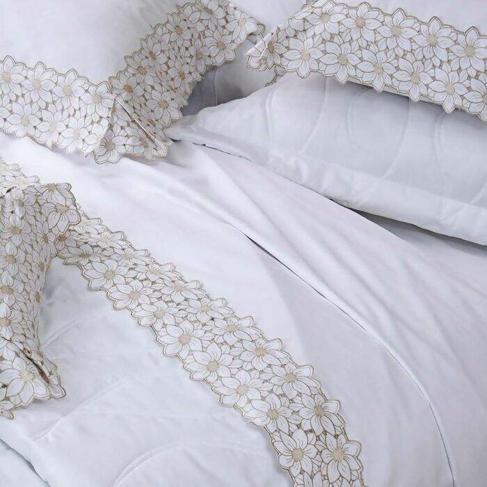 Descrição Jogo de Cama 300 Fios Bordado Íris Branco com Bege Queen - Marken Fassi