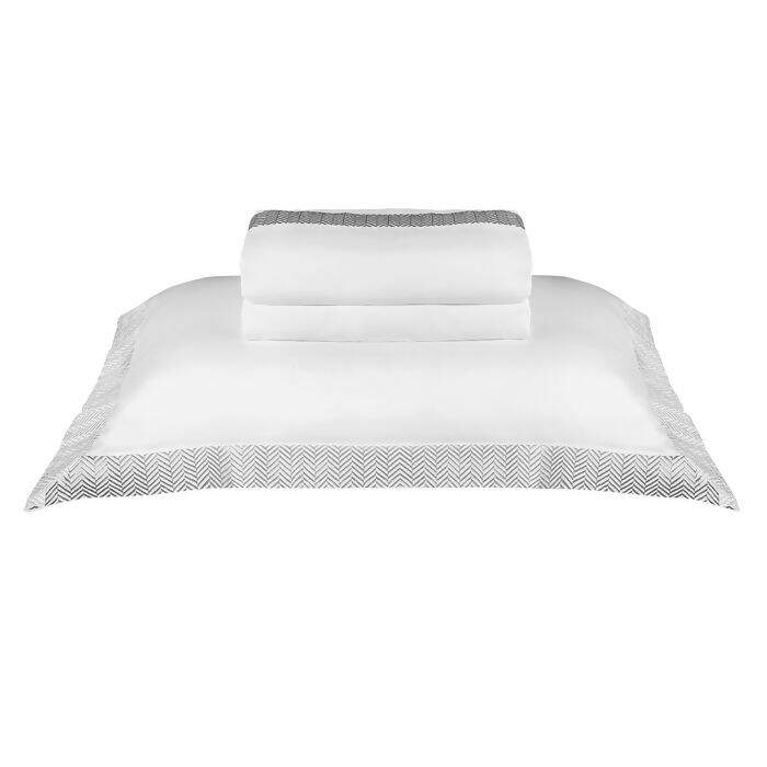 Descrição Jogo de Cama 300 Fios Bordado The East V Branco / Cinza Casal - By the Bed