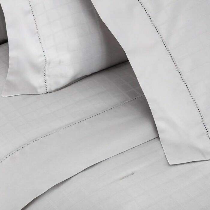 Tecido adamascado e um liso, ambos em cetim 300 fios, 100% algodão Fio Penteado - toque acetinado e macio; acabamento de excelente qualidade