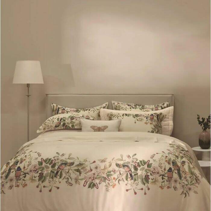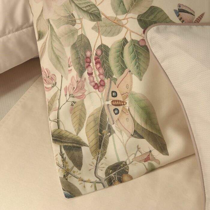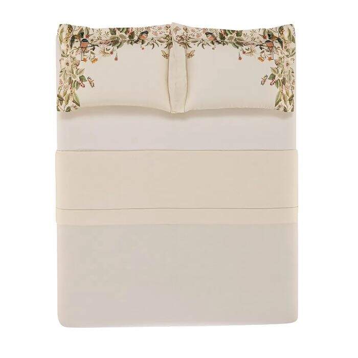 O Jogo de Cama Trussardi Sempione traz encanto e beleza à primeira vista, sua estampa digital é repleta de desenhos criativos e vividos, com pássaros, borboletas, flores e folhagens em tons de verde, azul, rosa e outros, com o fundo bege, o que traduz o prazer de relaxar e descansar sob o ritmo agradável do vento. Sua confecção é em 100% Algodão Egípcio, Cetim 300 fios, tecido mercerizado, perfeito para os dias mais frios, o cetim retém o calor, por ter a estrutura de entrelaçamento mais fechada. Encanta pelo toque de brilho e por seu caimento suave e macio.