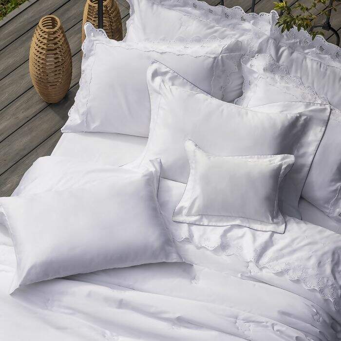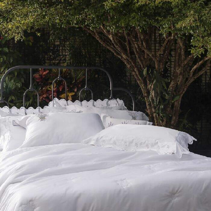 O Jogo de cama Diamante 400 Fios nos brinda com bordado de folhagens e pequenos arabescos. É confeccionado em algodão egípcio de 400 Fios, com toque acetinado, garantindo uma cama linda e confortável