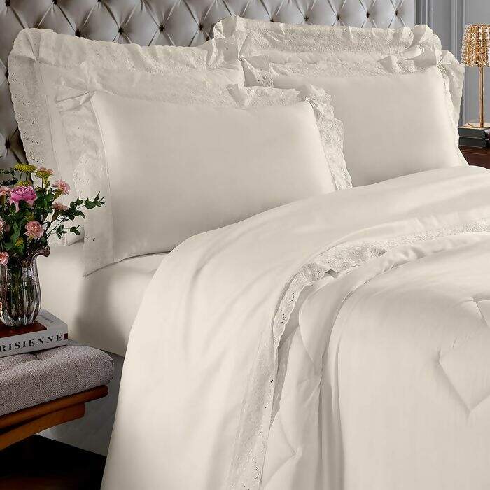 Jogo de Cama King Size com aplicação de Renda Bordada Clarys em Percal 300 fios! Um luxo da linha Nobre Buettner. Tecido em 100% algodão penteado, possui toque acetinado que proporciona leveza e sofisticação ao produto. Fronhas pespontadas com aplicação da renda Clarys, uma linda renda de arabescos em formatos ornamentais bordados sem brilho, e com 7cm de aba. Sobre lençol com dobra feita, vira e aplicação da renda, conferindo um visual requintado à sua cama. Os jogos de cama com aplicações de renda é tradição da marca Buettner! Com cores atuais da estação, a linha realmente remete ao luxo e encanto da marca!