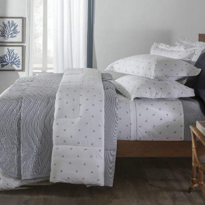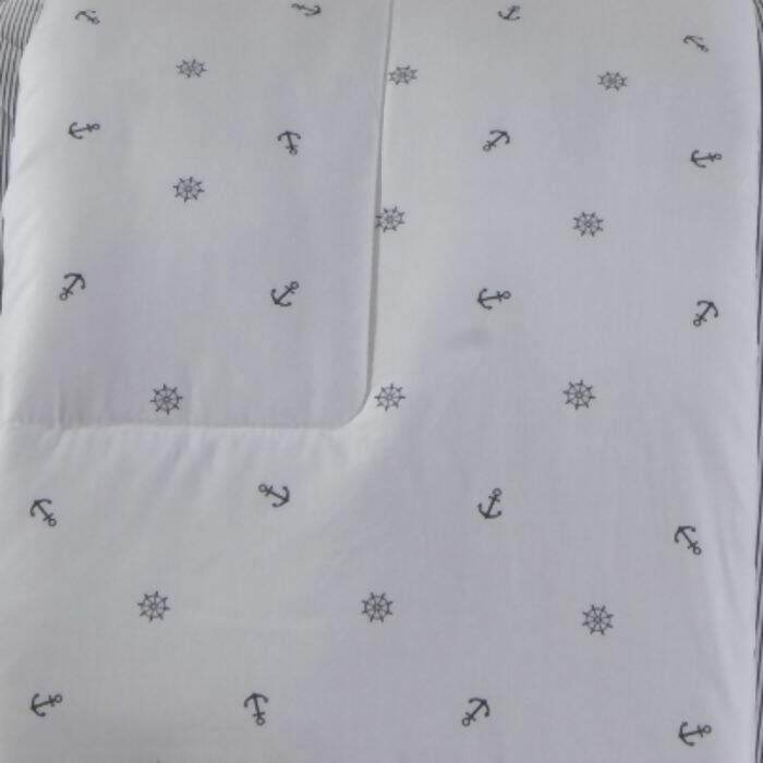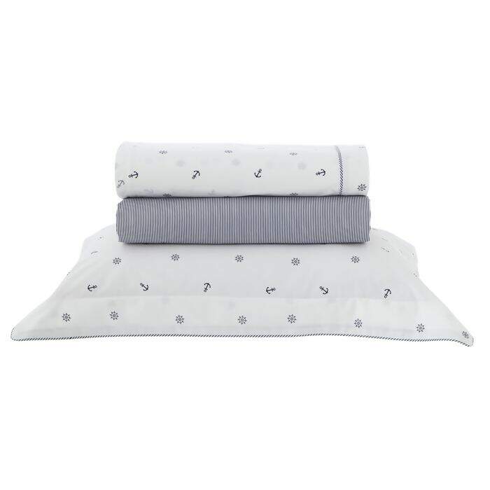 A coleção Ancor traz motivos Náuticos, com âncoras e timões estampados no lençol e fronhas, combinando com um listradinho azul marinho no lençol de elástico.