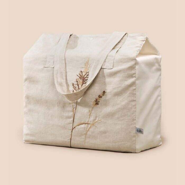 A embalagem do Jogo de Colcha Native Linho tem as mesmas características do produto e pode ser utilizada como bolsa.