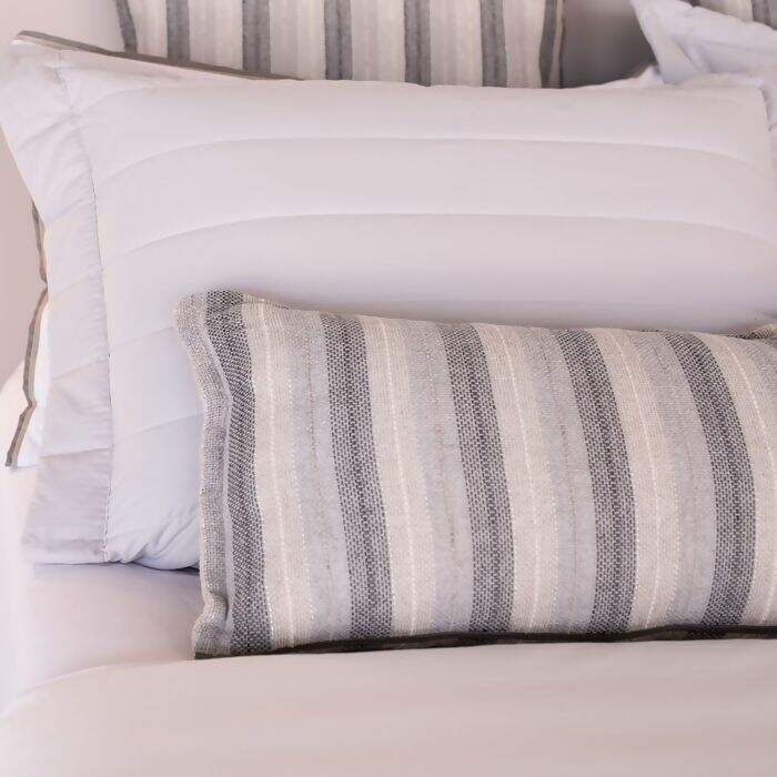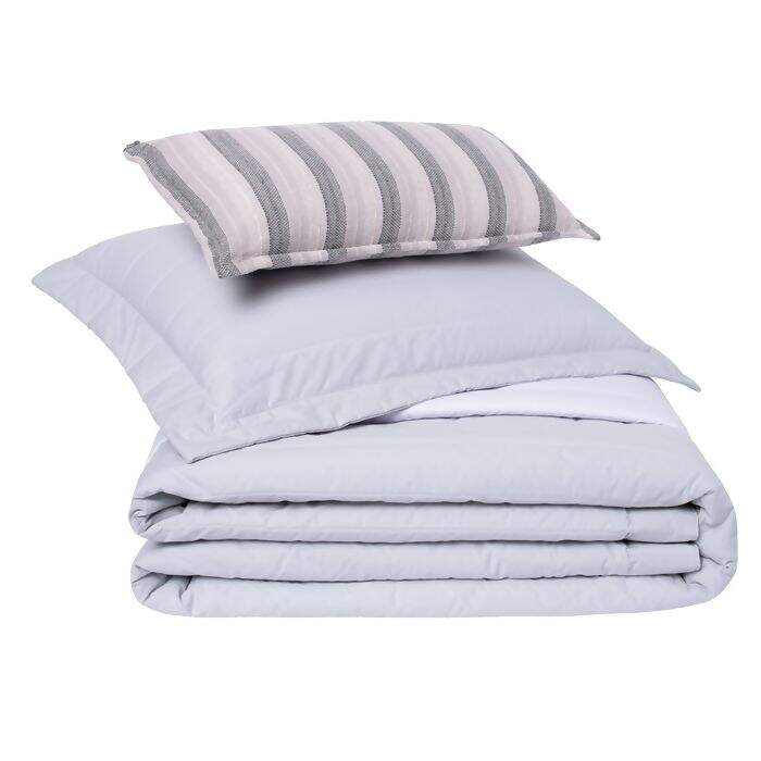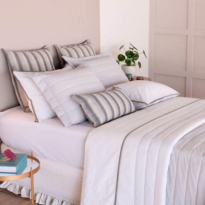 Confortável e ideal para o dia a dia, essa coleção em algodão é aquela que não tem erro na hora de compor a cama. O charme fica por conta da almofadinha em tear e do cobre leito dois em um.