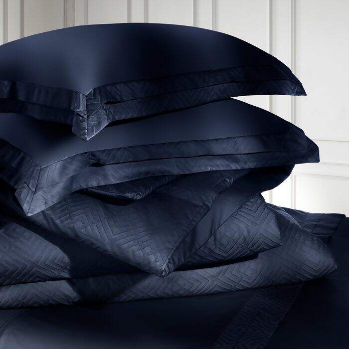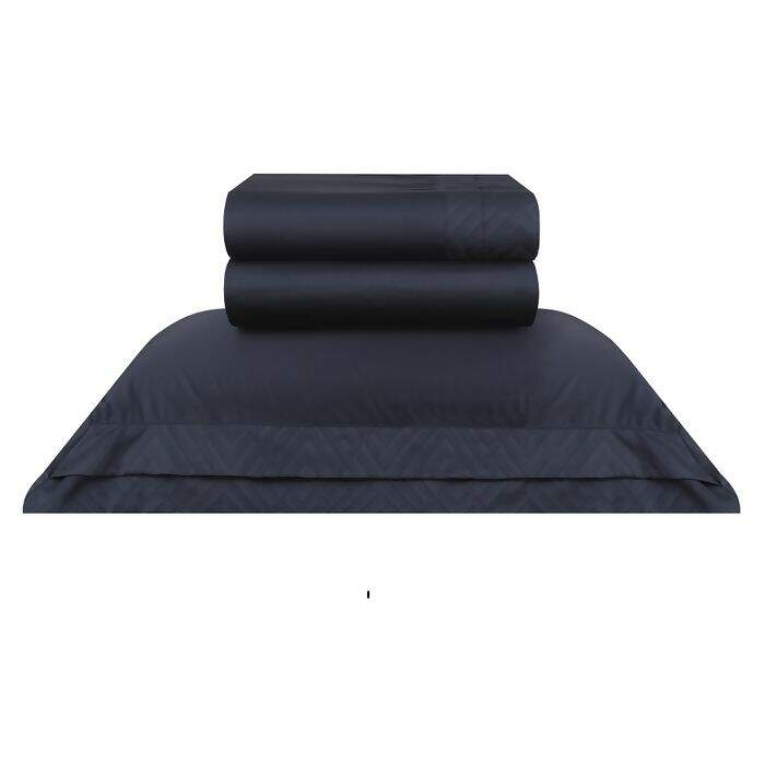Tanto o Duvet quanto as fronhas são azul marinho.