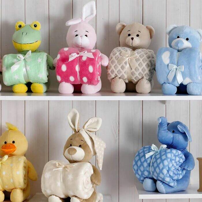 Kit Manta Infantil em Microfibra super Macia com Bichinho de Pelúcia, em 100% poliéster.