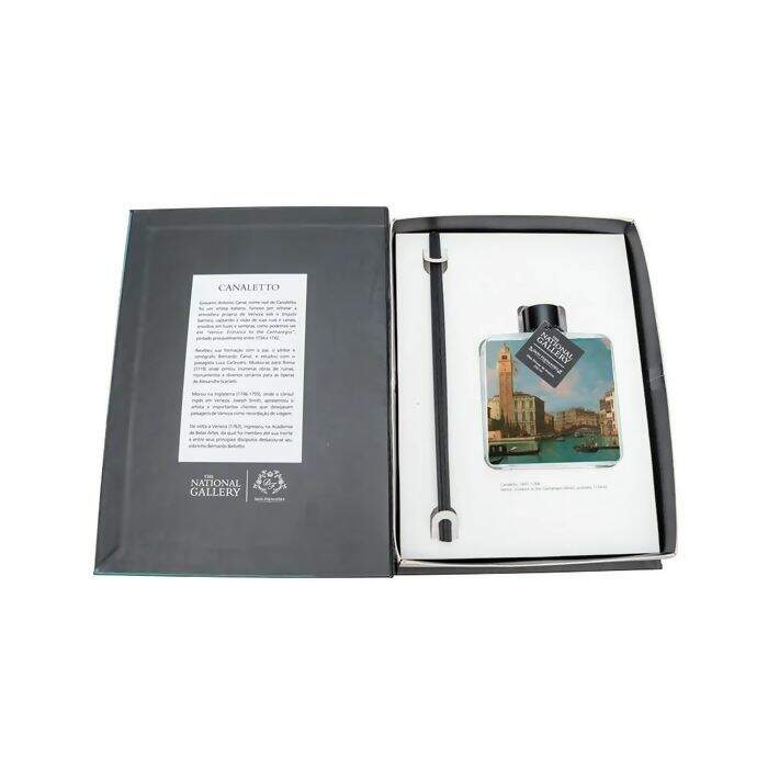 As obras ilustram a caixa livro e o frasco do difusor de aromas da coleção.
