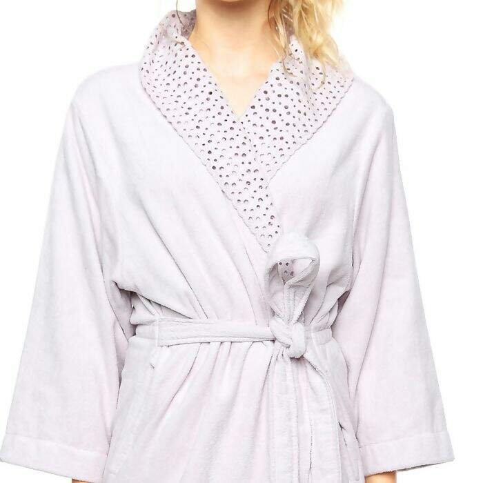 Roupão em veludo com gola xale e aplicação de renda guipure.