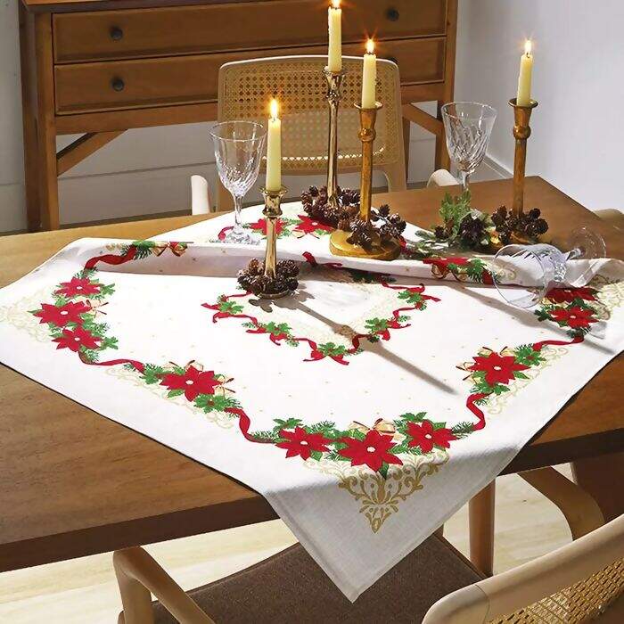 Toalha de mesa para deixar o seu Natal especial e cheio de elegância. Tecido em 50% algodão 50% poliéster, gramatura de 170 g/m². Para melhor conservação da sua toalha, siga as instruções de lavagem indicadas na etiqueta.