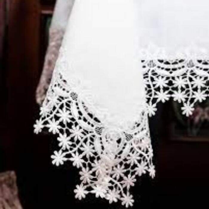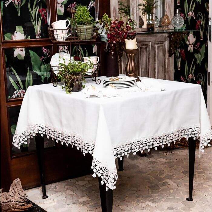 Toalha de Mesa com detalhes Guipure, em "Poli-Linho" (Poliéster com textura de Linho). Fácil de cuidar e passar, compõe uma mesa posta clássica e atemporal.