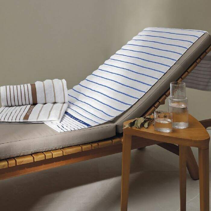 A toalha de praia Del Porto Adriático foi inspirada em um dos lagos mais lindos do norte da Itália, o di Garda, suas águas em tonalidades impressionantes e calmas são retratadas no design desta peça. Suas linhas harmoniosas combinadas com técnicas exclusivas em seu desenvolvimento relevam uma experiência de luxo que remete ao frescor do verão italiano.