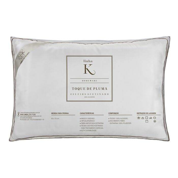 O Travesseiro Toque de Plumas possui revestimento em tecido de 233 fios 100% algodão, enchimento em fibras extra finas com sensação de plumas de ganso.